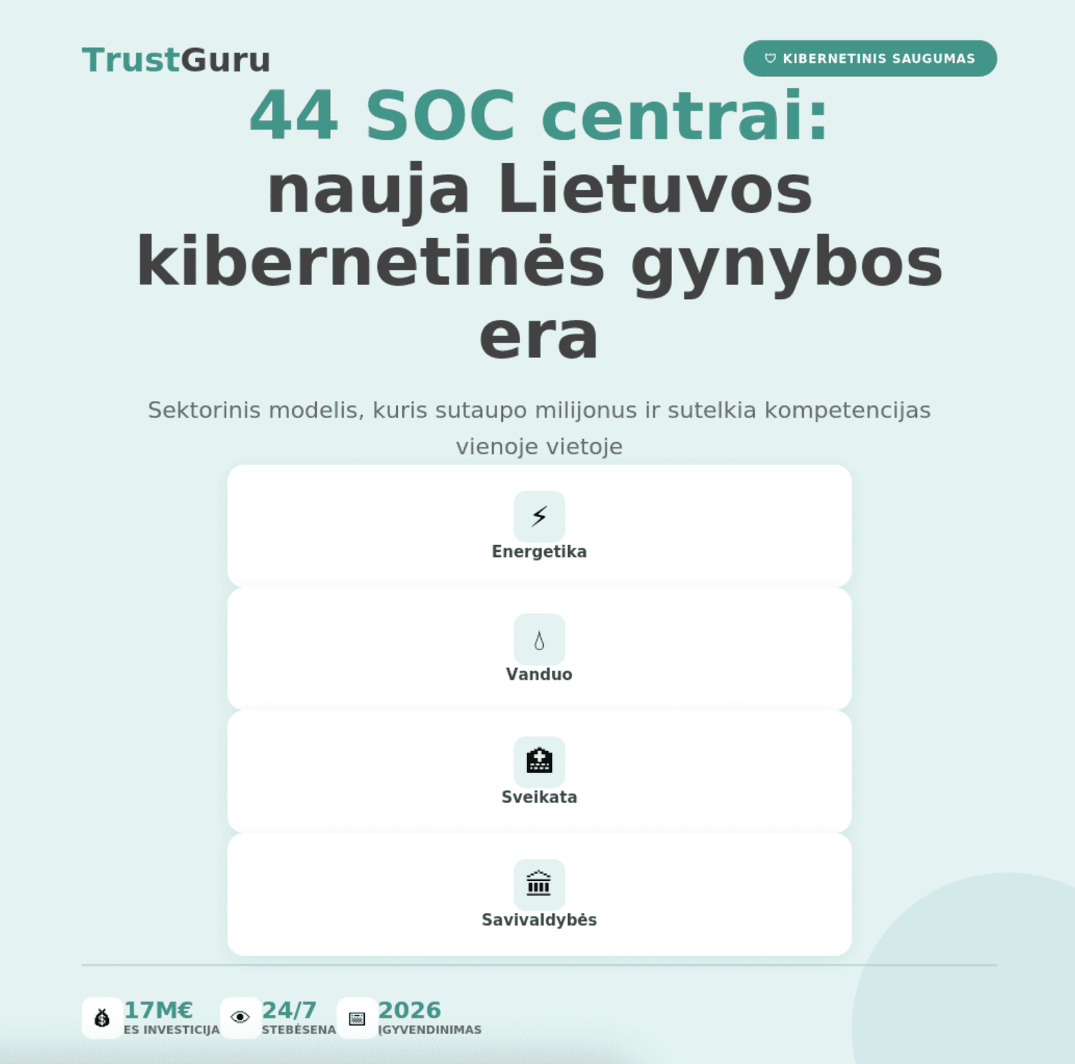 Sektoriniai SOC - tai strateginis Lietuvos žingsnis, kuriuo siekiama sukurti tvarią, centralizuotą ir efektyvią kibernetinės gynybos sistemą. Šis modelis padeda taupyti resursus, didina kompetencijos lygį ir leidžia užtikrinti vienodą saugumo standartą visame sektoriuje.